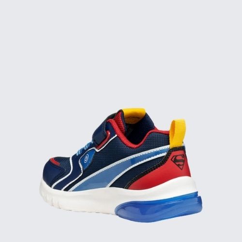 Sneaker for boys with an active modern design which takes its cues from the heroic Superman and was devised under the partnership between Geox and the Warner Bros. It boasts an upper made of a leather-effect material and fabric in a blue and red colourway and includes details which evoke the iconic cartoon character. Ciberdron has been fitted with lights in the sole that will brighten sporty schoolday outfits and leisuretime looks with a fun feel.